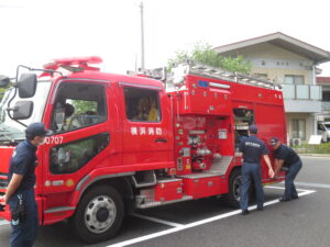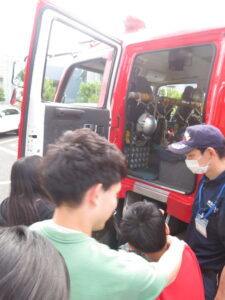 子ども達も、キリッとした雰囲気の消火訓練、普段見れない消防車の内側に興味津々でした♪
