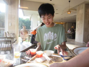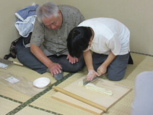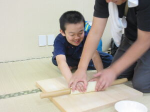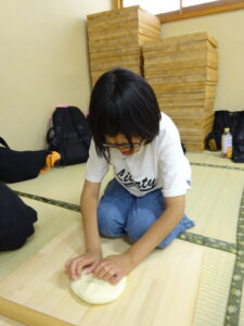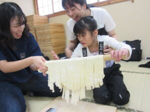 児童旅行2日目は「うどん作り体験」から始まりました。講師の方に「失敗したら美味しいうどんはできません…」と言われ、子ども達も職員も真剣な表情に…💦足で踏み、手で捏ね、慎重に生地をカットして…一人一人が一生懸命作りました。