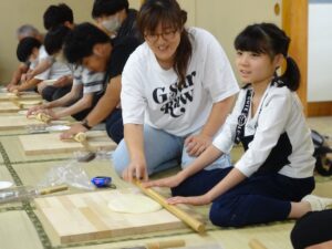 児童旅行2日目は「うどん作り体験」から始まりました。講師の方に「失敗したら美味しいうどんはできません…」と言われ、子ども達も職員も真剣な表情に…💦足で踏み、手で捏ね、慎重に生地をカットして…一人一人が一生懸命作りました。