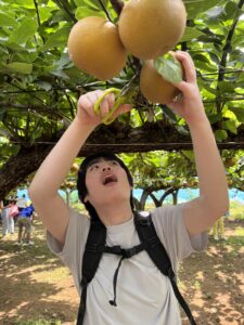 果実園に到着すると、スタッフさんの案内で梨エリアに移動しました。移動中も顔の高さにある梨やブドウにみんな興味津々。