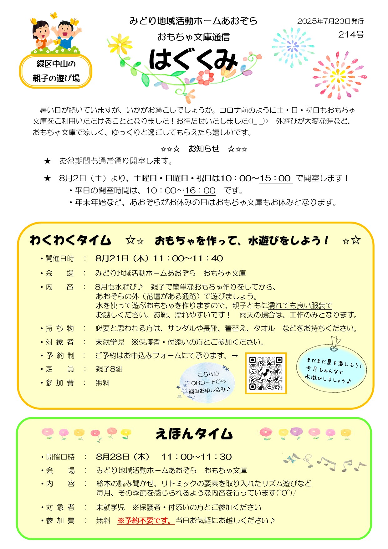 あおぞら おもちゃ文庫通信「はぐくみ」2025年8月号|お知らせ | 社会福祉法人 ル・プリ NEWS お知らせ ホームお知らせあおぞら おもちゃ文庫通信「はぐくみ」2025年8月号 2025.07.23 お知らせ あおぞら おもちゃ文庫通信「はぐくみ」2025年8月号 8月のわくわくタイム 申込みはこちら https://docs.google.com/forms/d/e/1FAIpQLSfu-NMJBAqGFbUV70-fL-n0A99cIXFKeNMR338XrGri-C283g/viewform?usp=header みどり地域活動ホームあおぞら 一覧へ戻る CATEGORY お知らせ イベント 施設情報 その他 ARCHIVE 2026 2025 2024 2023 2022 2021