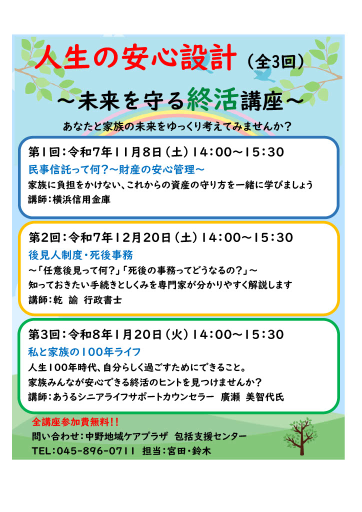 【連続講座】人生の安心設計 ~未来を守る終活講座~|お知らせ | 社会福祉法人 ル・プリ NEWS お知らせ ホームお知らせ【連続講座】人生の安心設計 ~未来を守る終活講座~ 2025.08.14 お知らせイベント施設情報その他 【連続講座】人生の安心設計 ~未来を守る終活講座~ 人生100年時代に向けて、安心して未来を迎えるためのヒントを勉強しませんか? 信託、後見制度、終活3つの視点から専門家が分かりやすくお伝えします。 横浜市中野地域ケアプラザ 一覧へ戻る CATEGORY お知らせ イベント 施設情報 その他 ARCHIVE 2025 2024 2023 2022 2021