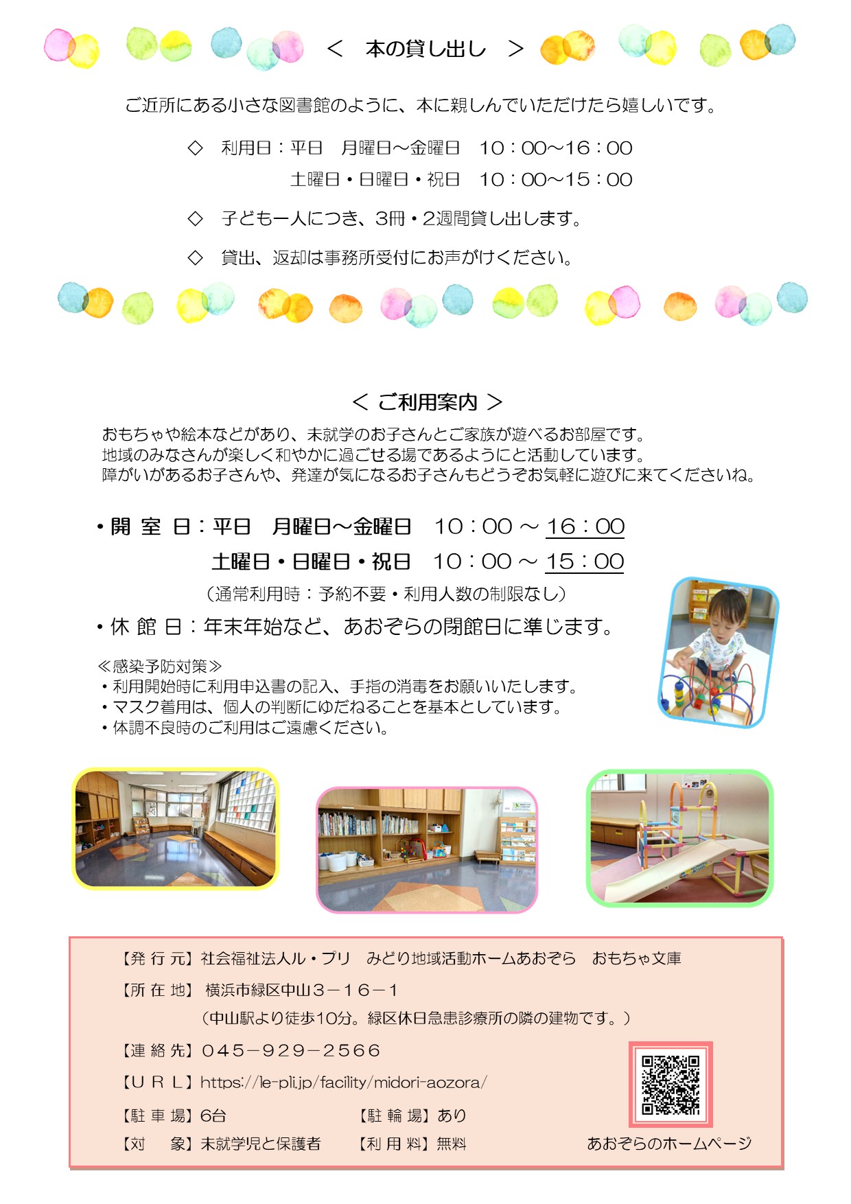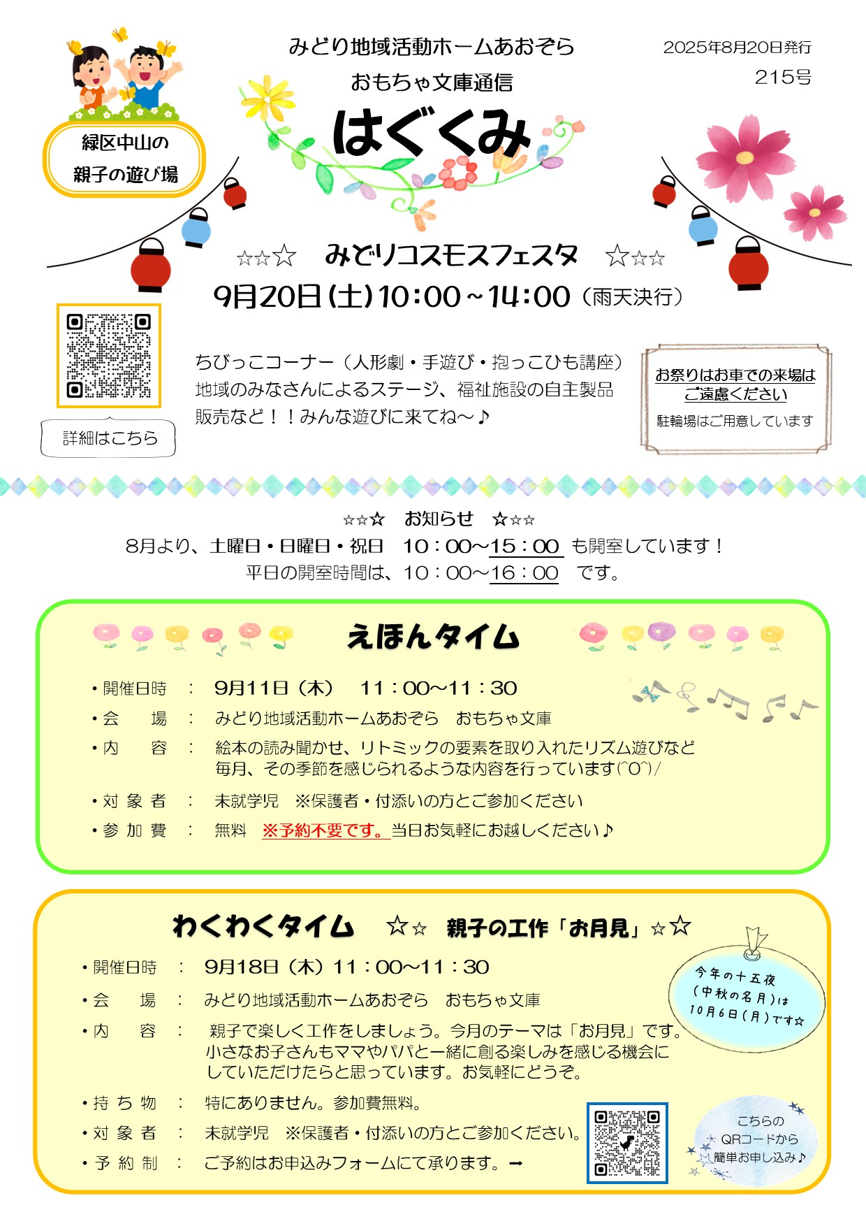 あおぞら おもちゃ文庫通信「はぐくみ」2025年9月号|お知らせ | 社会福祉法人 ル・プリ NEWS お知らせ ホームお知らせあおぞら おもちゃ文庫通信「はぐくみ」2025年9月号 2025.08.20 お知らせ あおぞら おもちゃ文庫通信「はぐくみ」2025年9月号 9月のわくわくタイム 申込みはこちら https://docs.google.com/forms/d/e/1FAIpQLSeKpAV76xds0B72NCjxhLoJuLG8gRXbrLWiRi71yB3PC1T4Wg/viewform?usp=header みどり地域活動ホームあおぞら 一覧へ戻る CATEGORY お知らせ イベント 施設情報 その他 ARCHIVE 2026 2025 2024 2023 2022 2021