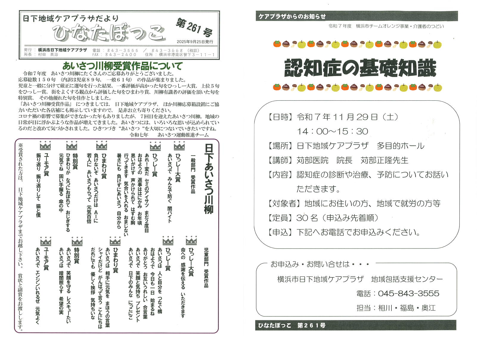 広報誌ひなたぼっこ261号のお知らせ!|お知らせ | 社会福祉法人 ル・プリ NEWS お知らせ ホームお知らせ広報誌ひなたぼっこ261号のお知らせ! 2025.09.27 お知らせイベント施設情報その他 広報誌ひなたぼっこ261号のお知らせ! 表 裏 ★印刷していただく場合は、画像を保存の上、画像印刷でお願い致します。 横浜市日下地域ケアプラザ 一覧へ戻る CATEGORY お知らせ イベント 施設情報 その他 ARCHIVE 2025 2024 2023 2022 2021