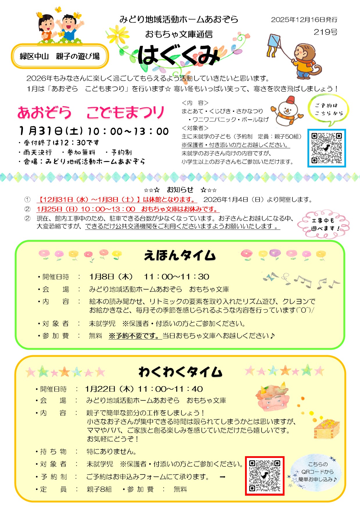 あおぞら おもちゃ文庫通信「はぐくみ」2026年1月号|お知らせ | 社会福祉法人 ル・プリ NEWS お知らせ ホームお知らせあおぞら おもちゃ文庫通信「はぐくみ」2026年1月号 2025.12.16 お知らせ あおぞら おもちゃ文庫通信「はぐくみ」2026年1月号 1月のイベント予約はこちら 【1月22日(木)わくわくタイム】 https://docs.google.com/forms/d/e/1FAIpQLSdRFaS6agk7tOGwsI6mHufGvfsuTOQ3HxEDMtH2zOaql7a0qw/viewform?usp=header 【1月31日(土)あおぞらこどもまつり】 https://docs.google.com/forms/d/e/1FAIpQLScipM0_3eRo8L0kBiw1Pd_w-oIQp9tIVN9E6ITmXldMMZGCjA/viewform?usp=header みどり地域活動ホームあおぞら 一覧へ戻る CATEGORY お知らせ イベント 施設情報 その他 ARCHIVE 2026 2025 2024 2023 2022 2021