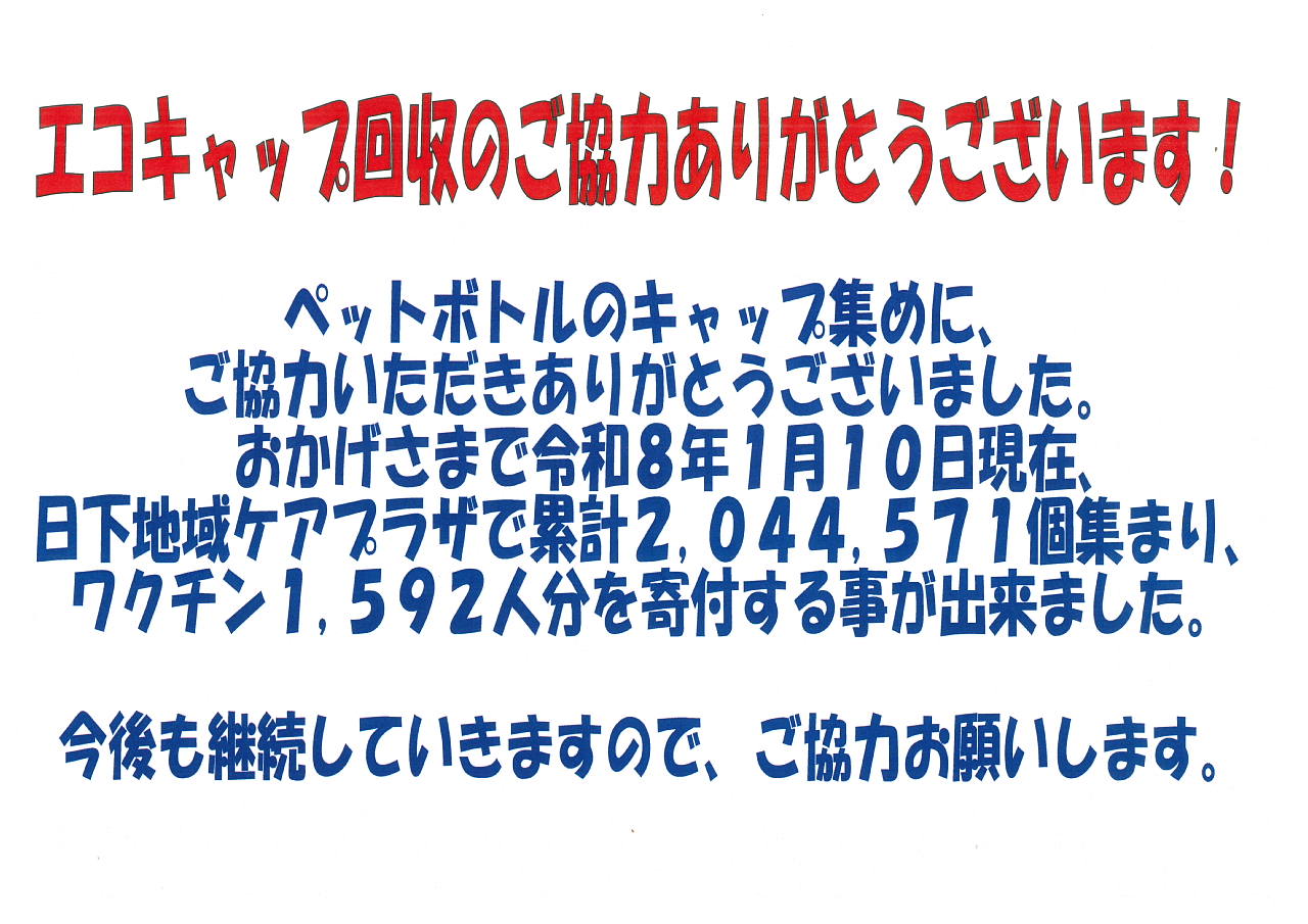 エコキャップ(ペットボトルのキャップ)回収のお礼!|お知らせ | 社会福祉法人 ル・プリ NEWS お知らせ ホームお知らせエコキャップ(ペットボトルのキャップ)回収のお礼! 2026.01.10 お知らせイベント施設情報その他 エコキャップ(ペットボトルのキャップ)回収のお礼! 横浜市日下地域ケアプラザ 一覧へ戻る CATEGORY お知らせ イベント 施設情報 その他 ARCHIVE 2026 2025 2024 2023 2022 2021