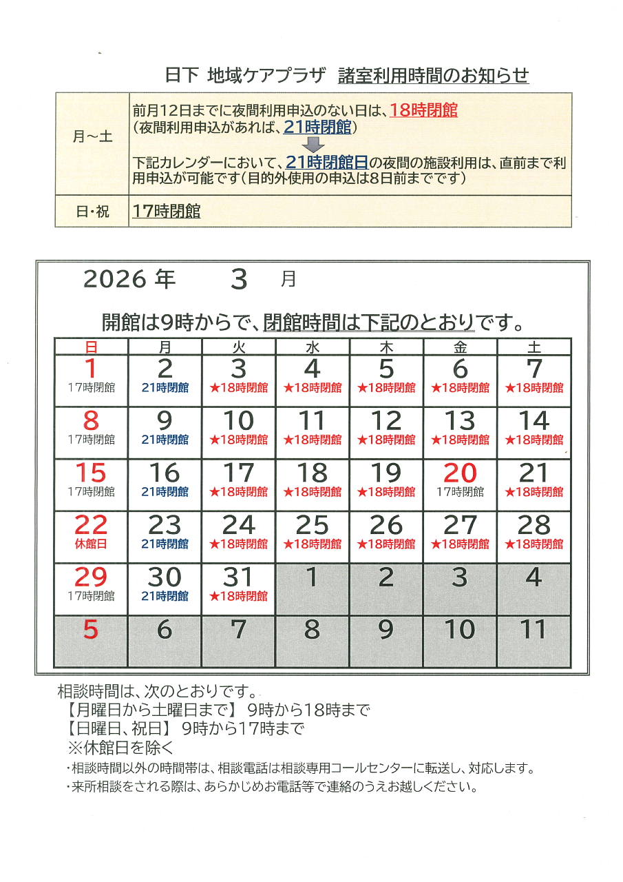 令和8年3月 日下地域ケアプラザ 諸室利用時間のお知らせ!|お知らせ | 社会福祉法人 ル・プリ NEWS お知らせ ホームお知らせ令和8年3月 日下地域ケアプラザ 諸室利用時間のお知らせ! 2026.02.24 お知らせイベント施設情報その他 令和8年3月 日下地域ケアプラザ 諸室利用時間のお知らせ! ★印刷していただく場合は、画像を保存の上、画像印刷でお願い致します。 横浜市日下地域ケアプラザ 一覧へ戻る CATEGORY お知らせ イベント 施設情報 その他 ARCHIVE 2026 2025 2024 2023 2022 2021