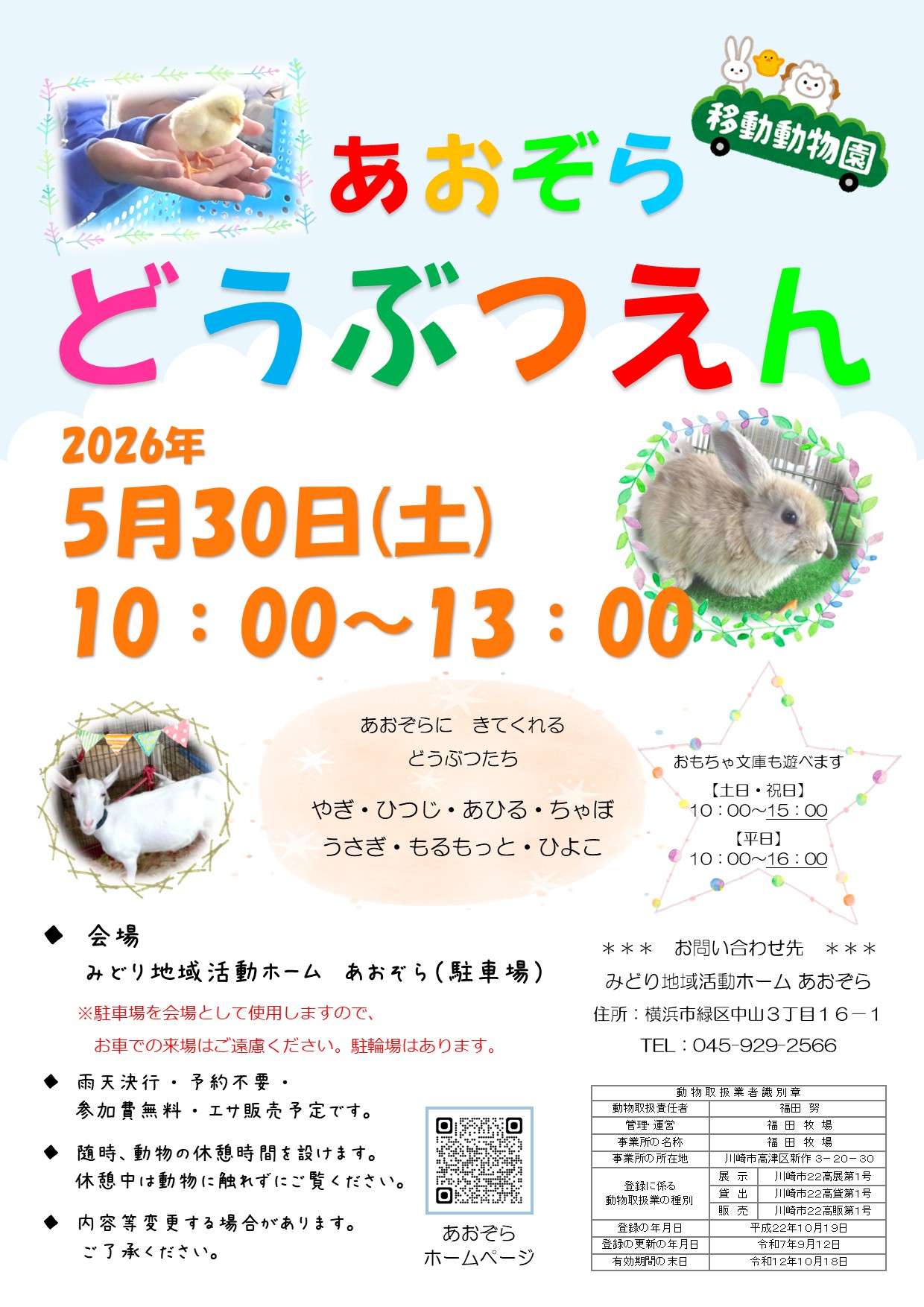 2026年5月30日(土)あおぞら どうぶつえん 開催します!|お知らせ | 社会福祉法人 ル・プリ NEWS お知らせ ホームお知らせ2026年5月30日(土)あおぞら どうぶつえん 開催します! 2026.04.20 お知らせ 2026年5月30日(土)あおぞら どうぶつえん 開催します! みどり地域活動ホームあおぞら 一覧へ戻る CATEGORY お知らせ イベント 施設情報 その他 ARCHIVE 2026 2025 2024 2023 2022 2021