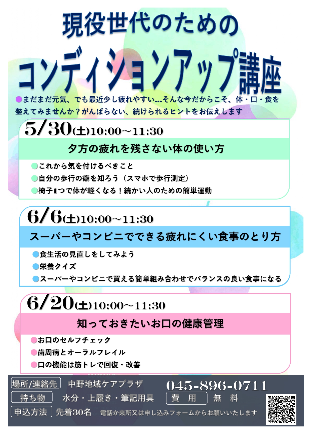「現役世代のためのコンディションアップ講座」のお知らせ|お知らせ | 社会福祉法人 ル・プリ NEWS お知らせ ホームお知らせ「現役世代のためのコンディションアップ講座」のお知らせ 2026.04.21 お知らせイベント施設情報 「現役世代のためのコンディションアップ講座」のお知らせ まだまだ元気、でも最近少し疲れやすい…そんな今だからこそ、体・口・食を整えてみませんか?がんばらない、続けられるヒントをお伝えします。 横浜市中野地域ケアプラザ 一覧へ戻る CATEGORY お知らせ イベント 施設情報 その他 ARCHIVE 2026 2025 2024 2023 2022 2021