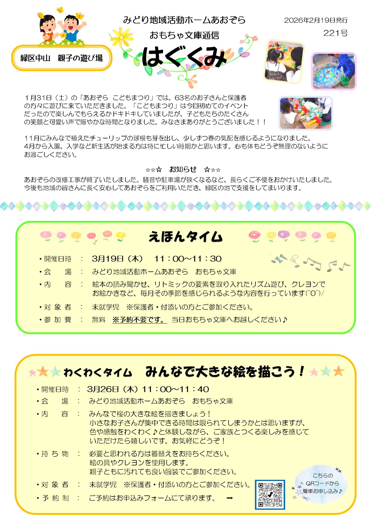 あおぞら おもちゃ文庫通信「はぐくみ」2026年3月号|お知らせ | 社会福祉法人 ル・プリ NEWS お知らせ ホームお知らせあおぞら おもちゃ文庫通信「はぐくみ」2026年3月号 2026.02.19 お知らせ あおぞら おもちゃ文庫通信「はぐくみ」2026年3月号 3月のイベント予約はこちら 【3月 わくわくタイム】 https://docs.google.com/forms/d/e/1FAIpQLSdT0MvDx0caNt75E_ycK2JMVYalhtWc-y8khRvXRvmf5lbDpg/viewform?usp=header みどり地域活動ホームあおぞら 一覧へ戻る CATEGORY お知らせ イベント 施設情報 その他 ARCHIVE 2026 2025 2024 2023 2022 2021